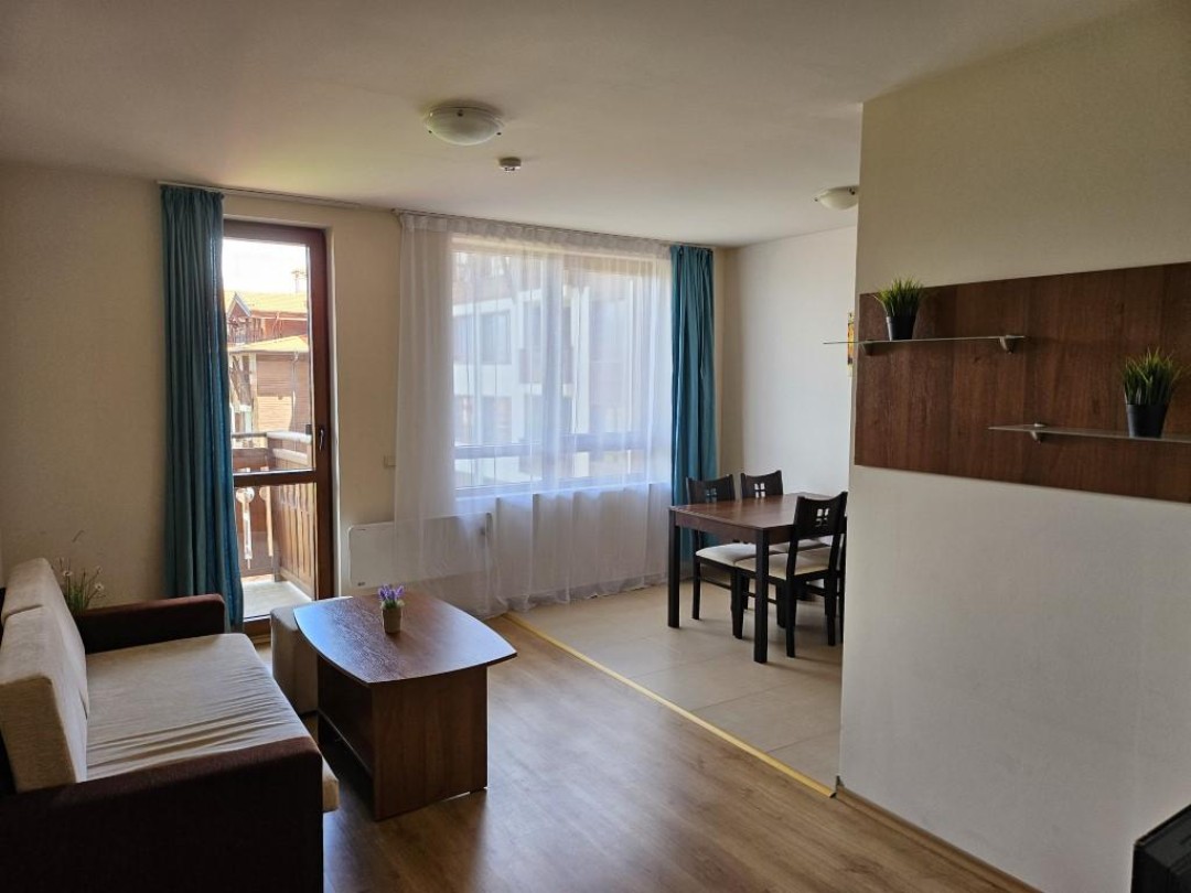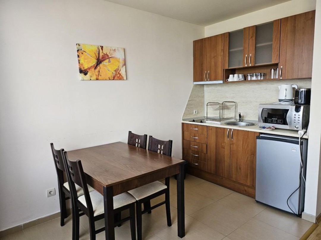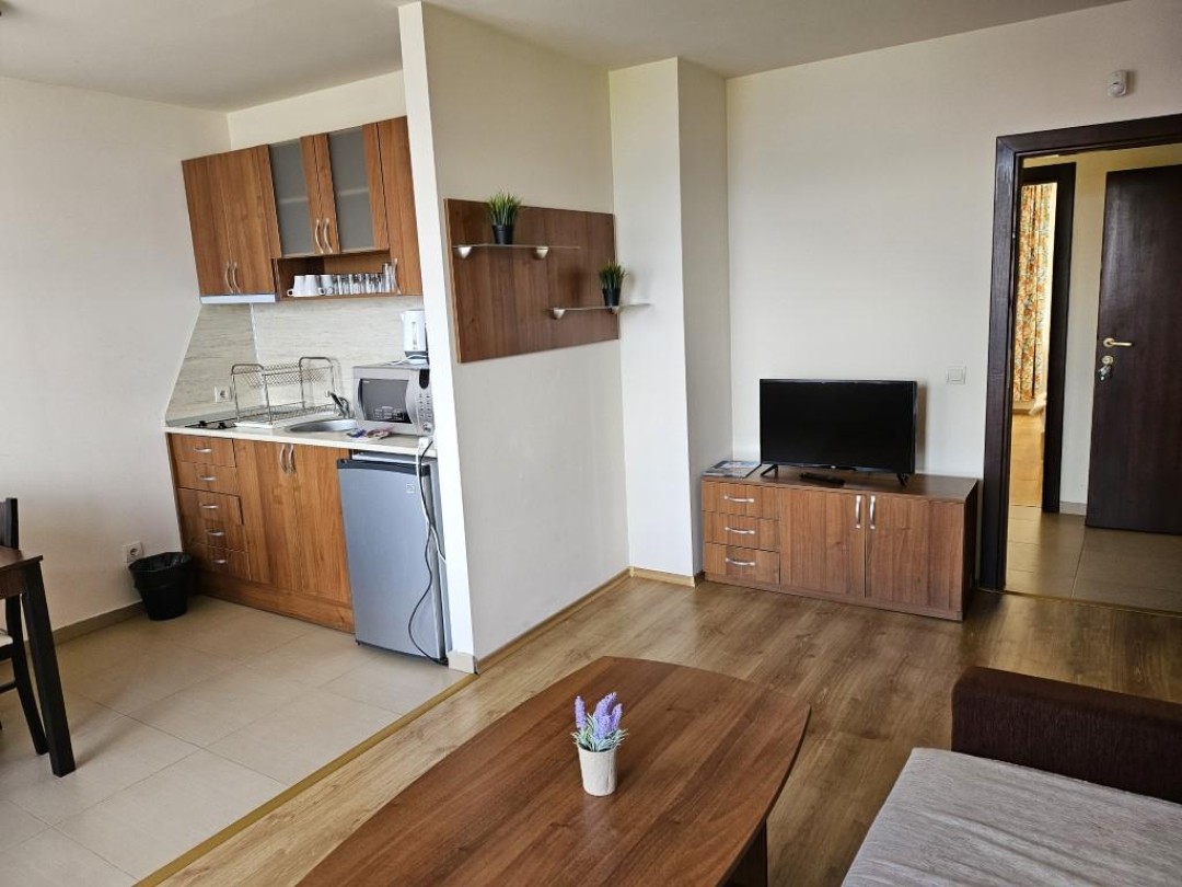 Дневната разполага с кухненски бокс, маса за хранене и столове, холна масичка, диван и телевизор.